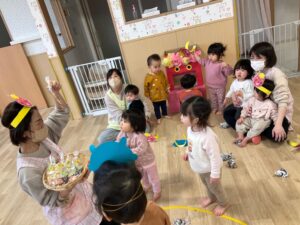 豆まき遊びで盛り上がっているところへ鬼が登場です。