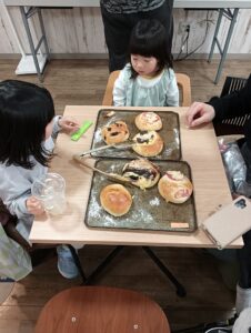 「パン生地のガスを抜いてあげることで焼き上がりがきれいでおいしく焼く事ができます。」の説明に、「あっ、これがガスか~!!」と押したパン生地からガスでぷくっとなった様子を観察している親子さんの姿もありましたよ♪