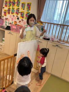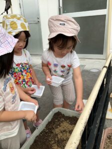 それぞれの入れ物に種を入れてもらい自分でつまんでまきます。「ぱらぱらー」と言いながらみんなとっても上手にできました。