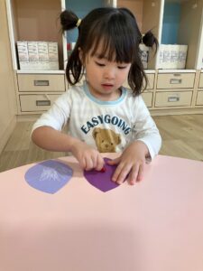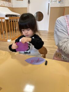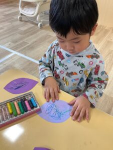 さつまいもの形に切った画用紙にお絵描きもしました。「あか!あお!」とそれぞれの好きな色を選んでいました。