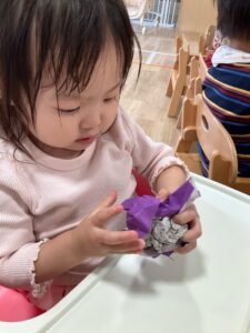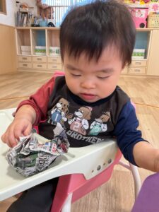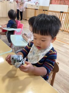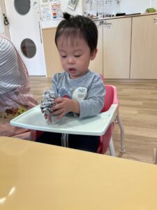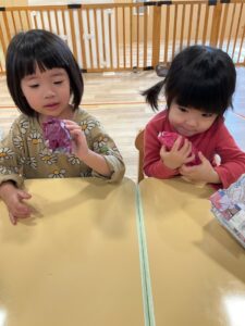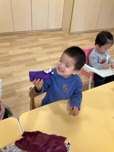 完成したおいもを持ってパクパク「おいしー」と食べる真似をする子もいましたよ。