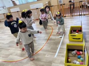 製作でつくった帽子をかぶりおにの箱めがけて新聞豆を投げました。