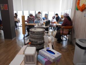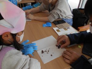 チョコレートについての話/ハスク(皮)とチュニブ(胚芽)の取り除き/カカオ豆を実際に食べる/カカオ豆を石臼で挽く/石臼から出てきたそのままのチョコレートを試食し牛乳に溶かしてココアにして試飲/マシュマロに付けて試食(甘味が加わることでおいしさの違いを感じられる)/チョコレートを型に入れてタッピングなどたくさんの工程の体験をしていただきました。