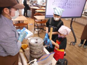 参加者さんからは「市販のチョコはあまり買わないのですが今日は本物のチョコレートを食べることができて満足でした。」「実際体験させてもらって時間をかけて作られているチョコレートは特別だなと思いました。」「丁寧な説明で大変よく理解ができました。」「おいしかった!楽しかった。」などの声をいただきました。